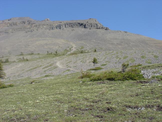 A clear view of the summit, summit ridge, and some of the alpine meadow above the cliff band. Very nice!