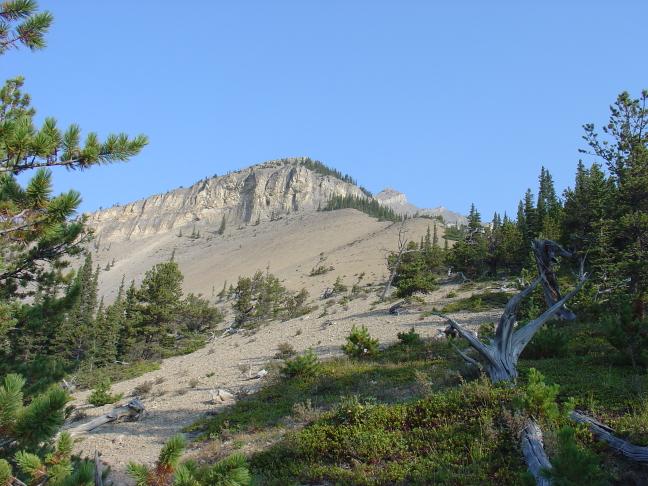 Just leaving the tree line, you can see the scree slope and first cliff band up close. Gain the ridge on the right as soon as you can to avoid slogging up loose scree.