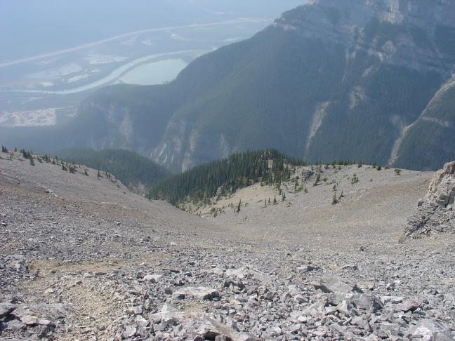 The scree run into the drainage on my way down. If you choose to go down the same way you came up (advised), follow this scree run to the upper cliff band only.