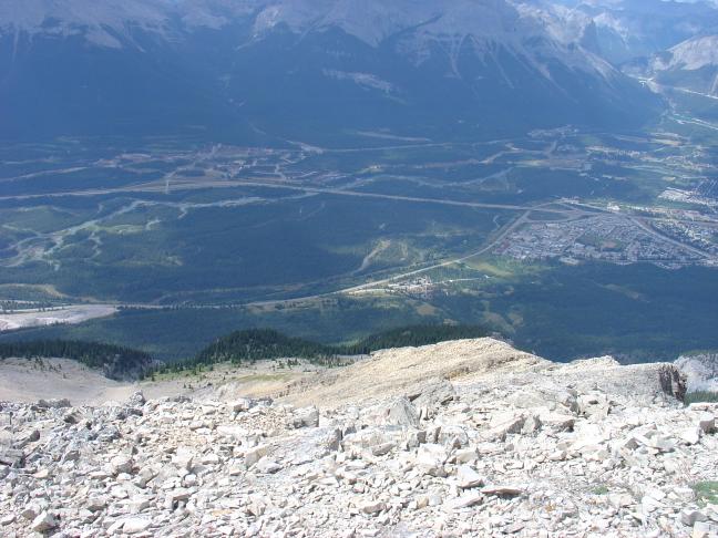 My ascent route, or at least the top bit of it. I came up the green hump immediately to the skier's left of the canyon, than straight up the scree, more or less.