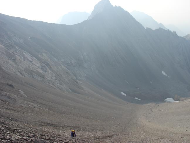 Kevin, in a bad patch of scree, probably sliding backward and cursing. Observe the smoke... It wasn't so thick when we were down there by the snow-patch at the bottom.