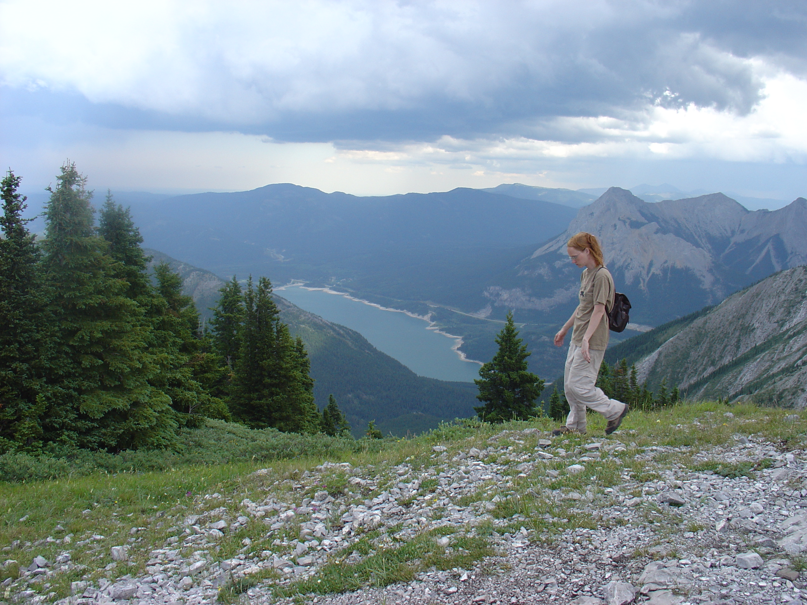 A nice view of Barrier Lake, Highway 40, and Mount Baldy, partly obscured by red hair. The west peak of Baldy doesn't look like much at all from up here!